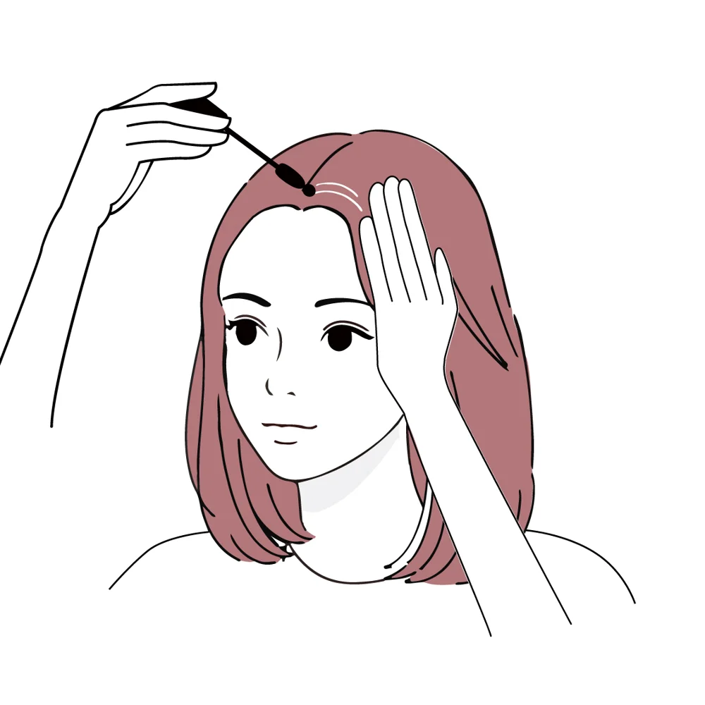白髪が多い部分は、手で髪を軽く押さえて、ブラシの面で生え際から毛先に向かってブラシをすべらせるように適量を髪に塗布します。