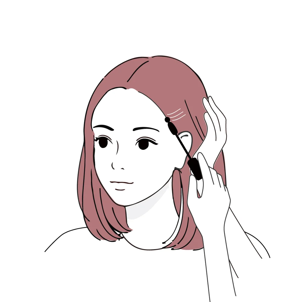 細かい部分、根元ギリギリまでしっかり塗りたい場合は、手で髪を軽く押さえて、ブラシの先端に付いているポンポンで塗布することでブラシに髪が絡みにくくなります。