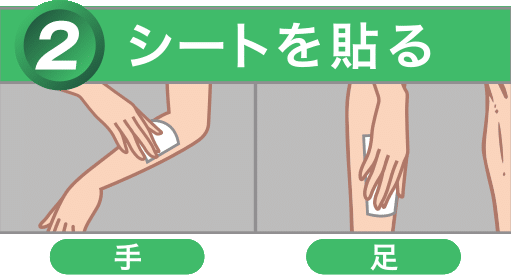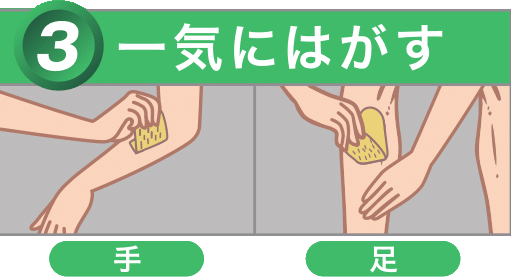 処理を重ねていくと、痛みは少なくなっていきます。皮膚が柔らかい部分は痛みを感じやすいので、使用の際は、はがす方向と逆の方向に反対の手で皮膚を押さえてください。